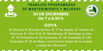Martes 30 de diciembre de 07,00 a 08,30 horas: DPEC trabajos de mantenimiento