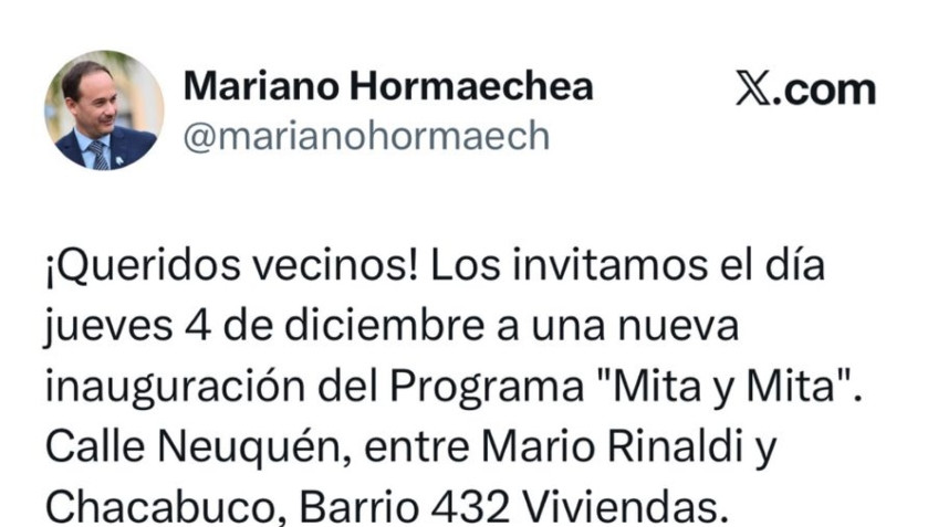 El jefe comunal de Goya en su mensaje expresó: “¡Queridos vecinos! Los invitamos el día jueves 4 de diciembre a una nueva inauguración del Programa “Mita y Mita”. Calle Neuquén, entre Mario Rinaldi y Chacabuco, barrio 432 viviendas. Horario: 20:00 hs. ¡Los esperamos!”