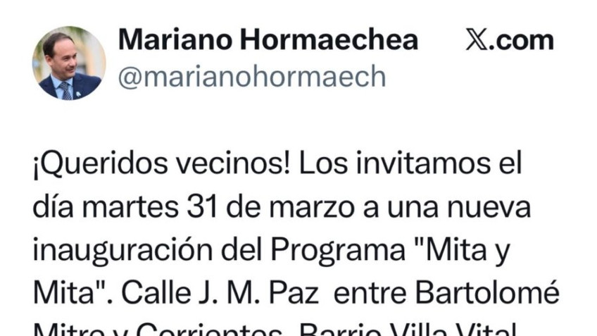 El intendente municipal de Goya doctor Mariano Hormaechea expresó: ¡Queridos vecinos! Los invitamos el día martes 31 de marzo a una nueva inauguración del Programa “Mita y Mita”. Calle J. M. Paz entre Bartolome Mitre y Corrientes, Barrio Villa Vital. Horario: 20 hs. ¡Los esperamos!