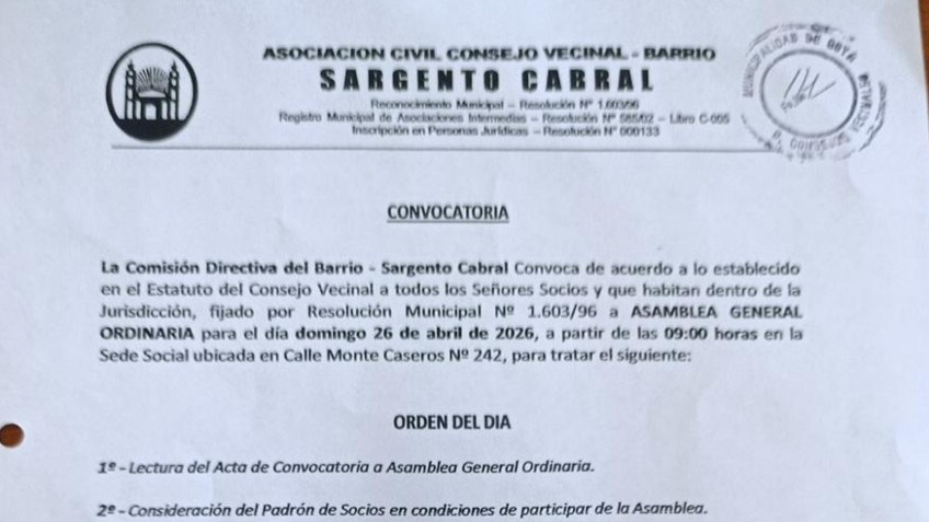 La Comisión Directiva del Barrio - Sargento Cabral Convoca de acuerdo a lo establecido en el Estatuto del Consejo Vecinal a todos los Señores Socios y que habitan dentro de la Jurisdicción, fijado por Resolución Municipal N° 1.603/96 a ASAMBLEA GENERAL ORDINARIA para el día domingo 26 de abril de 2026, a partir de las 09:00 horas en la Sede Social ubicada en Calle Monte Caseros N° 242, para tratar el siguiente: