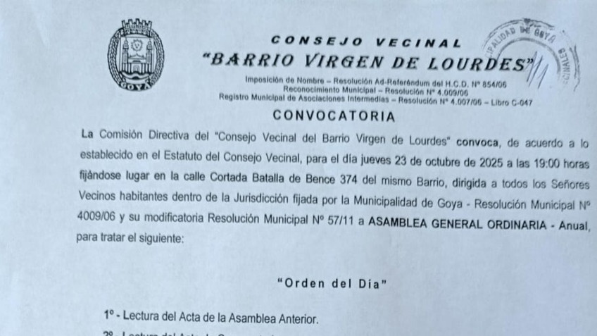 La Comisión Directiva del "Consejo Vecinal del Barrio Virgen de Lourdes" convoca, de acuerdo a lo establecido en el Estatuto del Consejo Vecinal, para el día jueves 23 de octubre de 2025 a las 19:00 horas fijándose lugar en la calle Cortada Batalla de Bence 374 del mismo Barrio, dirigida a todos los Señores Vecinos habitantes dentro de la Jurisdicción fijada por la Municipalidad de Goya - Resolución Municipal N° 4009/06 y su modificatoria Resolución Municipal N° 57/11 a ASAMBLEA GENERAL ORDINARIA - Anual, para tratar el siguiente: