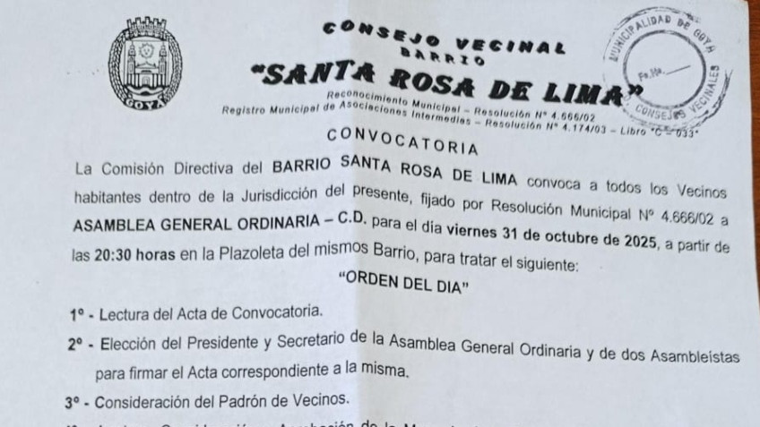 La Comisión Directiva del BARRIO SANTA ROSA DE LIMA convoca a todos los Vecinos habitantes dentro de la Jurisdicción del presente, fijado por Resolución Municipal N° 4.666/02 a ASAMBLEA GENERAL ORDINARIA - C.D. para el día viernes 31 de octubre de 2025, a partir de las 20:30 horas en la Plazoleta del mismos Barrio, para tratar el siguiente: