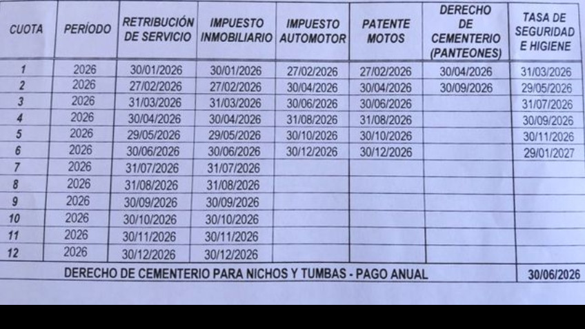 El próximo 30 de enero de 2026 vence la Primera Cuota del Período Fiscal 2026 correspondiente al Impuesto Inmobiliario y a la Tasa de Retribución de Servicios. Desde la Municipalidad se recuerda la importancia de cumplir en término con sus obligaciones fiscales, destacando además la vigencia del programa “Buen Contribuyente”, que permite a quienes se encuentren al día con impuestos y tasas municipales participar de sorteos con importantes premios.