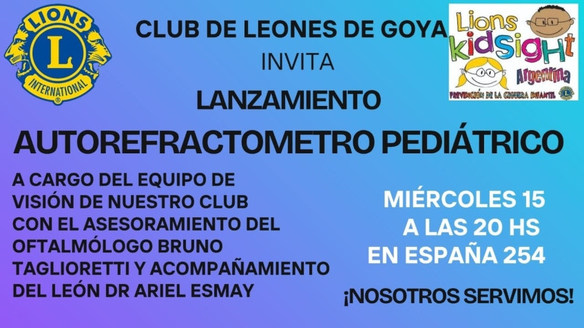 El Club de Leones de Goya realizará este miércoles 15 de octubre a las 20 horas, en su sede social, la presentación oficial del Autorefractómetro Pediátrico, un moderno equipo de detección visual que permitirá prevenir y diagnosticar tempranamente problemas oftalmológicos en niños.