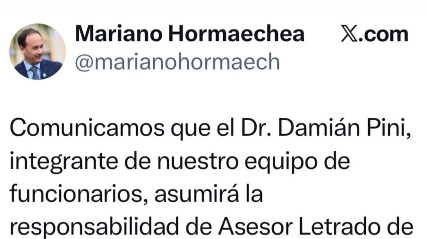 El intendente Mariano Hormaechea, desde sus redes oficiales anunció que el Dr. Damián Pini, integrante del equipo municipal, asumirá las funciones de Asesor Letrado de la Municipalidad.