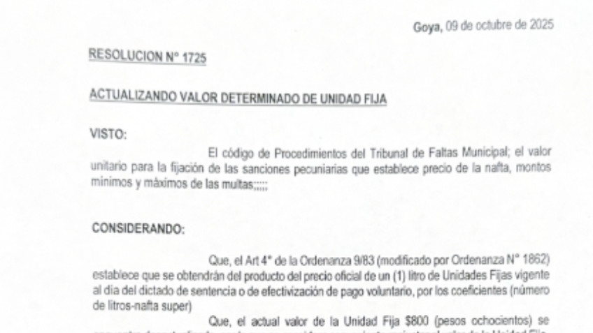 A través de la Resolución N° 1725, el Ejecutivo Municipal dispuso el reajuste del valor de la Unidad Fija utilizada para determinar las sanciones pecuniarias del Tribunal de Faltas. La medida eleva el monto de $800 a $1.000, en concordancia con el aumento del precio de los combustibles y el criterio establecido en la Ordenanza N° 9/83.