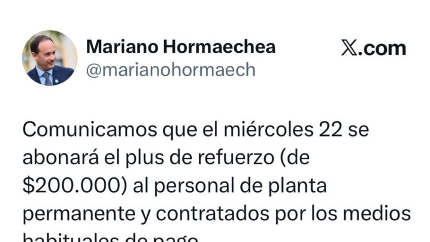 El Intendente Mariano Hormaechea a través de sus redes informó que el personal de Planta Permanente y Contratados dependiente del Municipio, percibirá el plus de refuerzo de 200 Mil Pesos, el miércoles 22 de octubre.