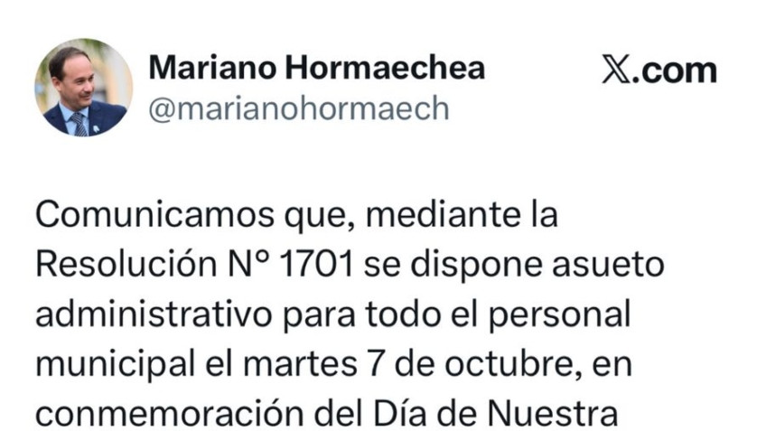El jefe comunal Mariano Hormaechea manifestó: “Comunicamos que, mediante la Resolución N° 1701 se dispone asueto administrativo para todo el personal municipal el martes 7 de octubre, en conmemoración del Día de Nuestra Señora del Rosario, patrona de Goya. Se garantiza la prestación de los servicios esenciales”.