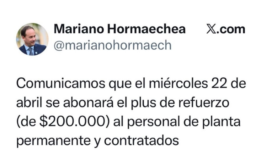 El Intendente Mariano Hormaechea desde sus redes anunció el pago del plus de refuerzo para los empleados municipales de planta y contratados, de 200 Mil Pesos, para el miércoles 22 a través de los medios habituales de pago.