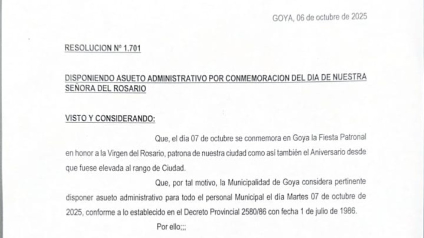Que, por tal motivo, la Municipalidad de Goya considera pertinente disponer asueto administrativo para todo el personal Municipal el día Martes 07 de octubre de 2025, conforme a lo establecido en el Decreto Provincial 2580/86 con fecha 1 de julio de 1986.