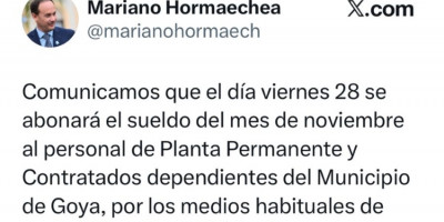 Intendente Mariano Hormaechea anunció el pago de haberes del mes de Noviembre