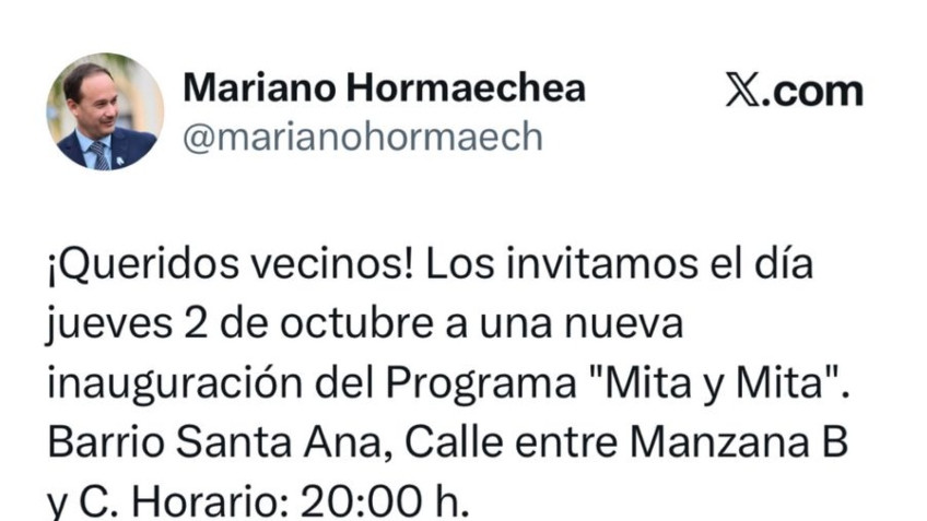 En la invitación cursada a la ciudadanía, expresa: “¡Queridos Vecinos! Los invitamos el día jueves 2 de octubre a una nueva inauguración del Programa “Mita y Mita”, Barrio Santa Ana, Calle entre Manzanas B y C. Horario 20 horas. ¡Los esperamos!”