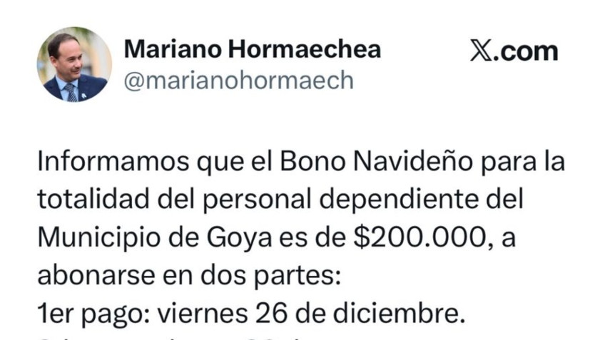 El intendente de Goya, doctor Mariano Hormaechea, anunció a través de sus redes sociales el pago de un bono de $200.000 destinado a todos los empleados municipales, con motivo de las fiestas de fin de año.