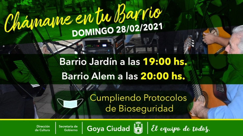 Desde las 19 horas los artistas de la Dirección de Cultura pondrán el acento musical con los clásicos del cancionero del litoral evocando a los grandes autores y compositores, con el apoyo de la Dirección de Juventud para invitar a los vecinos de esos barrios a ser partícipes de esta propuesta, con el cumplimiento del protocolo sanitario establecido.