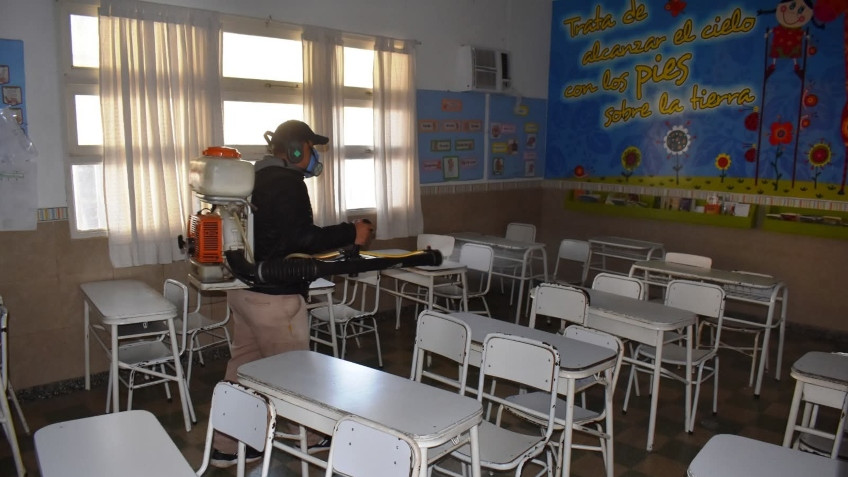 Otra de las acciones que implementa la gestión municipal, es la colaboración que brinda en la fumigación en instituciones escolares y colegios.