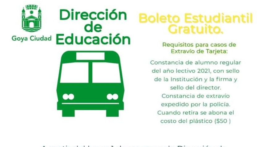 La Dirección de Educación de la Municipalidad de Goya informa que continúa la inscripción para el Boleto Estudiantil gratuito en el local de Paseo La Anónima, oficina 23, de 07:00 a 13:00 horas.