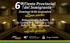El domingo 10 de noviembre, se realizarán las últimas actividades programadas de la Fiesta Provincial del Inmigrante que se habían suspendido por lluvia. Será en el Teatro Municipal, desde las 16 con la actuación de los ballets de Santa Lucia, Goya y Esquina.