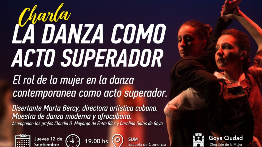La Dirección de la Mujer organiza para el jueves 12 de septiembre, a las 19:00 horas en el SUM de Escuela de Comercio, la charla “La danza como acto superador, el rol de la mujer en la danza contemporánea como acto superador”.