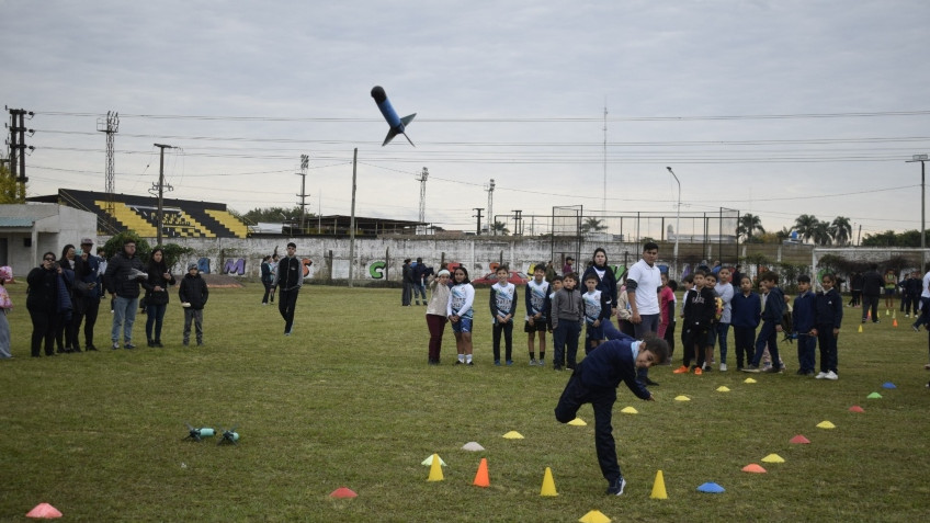 El espacio del Centro de Educación Física de Goya (Gimnasio Escolar), fue acondicionado para que los niños desde 4, 5 años a 12 pudieran demostrar sus habilidades y capacidades atléticas en salto en largo y lanzamientos, adaptados en este caso de “pelotitas” “cohetes” carrera de velocidad y salto en largo.