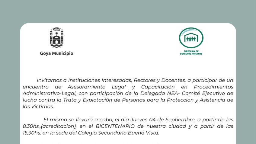 La Dirección de Derechos Humanos de la Municipalidad de Goya, dependiente de la Secretaría de Gobierno y bajo la coordinación de la doctora Gisela Dezorzi, invita a instituciones interesadas, rectores y docentes a participar de una jornada de asesoramiento legal y capacitación en procedimientos administrativo-legales.