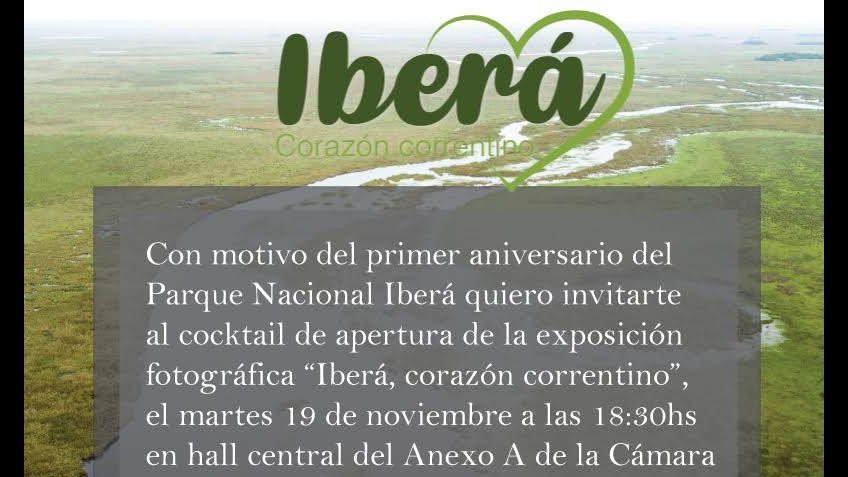 La Diputada Nacional oriunda de Goya Sofía Brambilla ha cursado la invitación para el próximo martes 19 de noviembre, con motivo de cumplirse el primer aniversario del Parque Nacional Iberá, al coktail de apertura de la exposición fotográfica: “Iberá, corazón correntino”, a las 18 :30 horas en el Hall Central del Anexo A de la Cámara de Diputados de la Nación, sito en Avenida Rivadavia 1841 de CABA