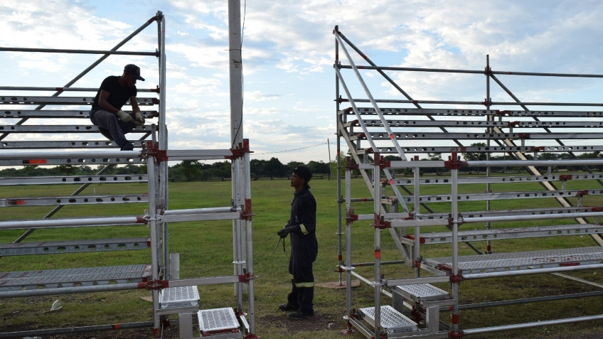 En el Corsódromo del Multiespacio Ferial Costa Surubí, se trabaja precisamente en la instalación de las estructuras para que el público cuente con la disponibilidad de más lugares para observar la Fiesta del Carnaval desde esas tribunas.