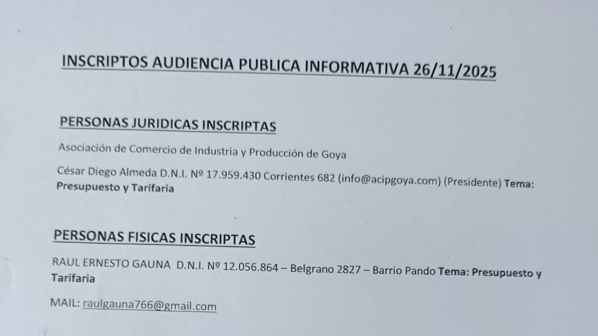 Inscriptos para audiencia pública por el presupuesto y tarifaria 2026