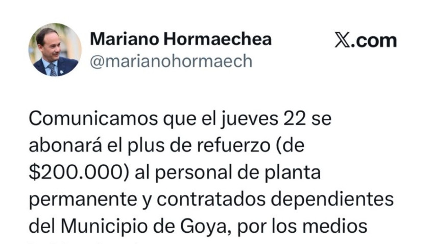 En su mensaje, el jefe de la comuna de Goya expresó: “Comunicamos que el jueves 22 se abonará el plus de refuerzo (de $200.000) al personal de planta permanente y contratados dependientes del Municipio de Goya, por los medios habituales de pago”. #GoyaHaciaAdelante