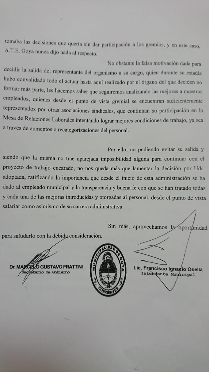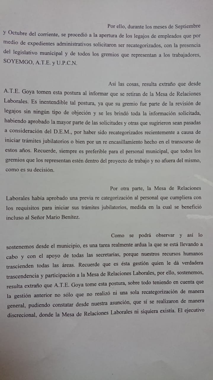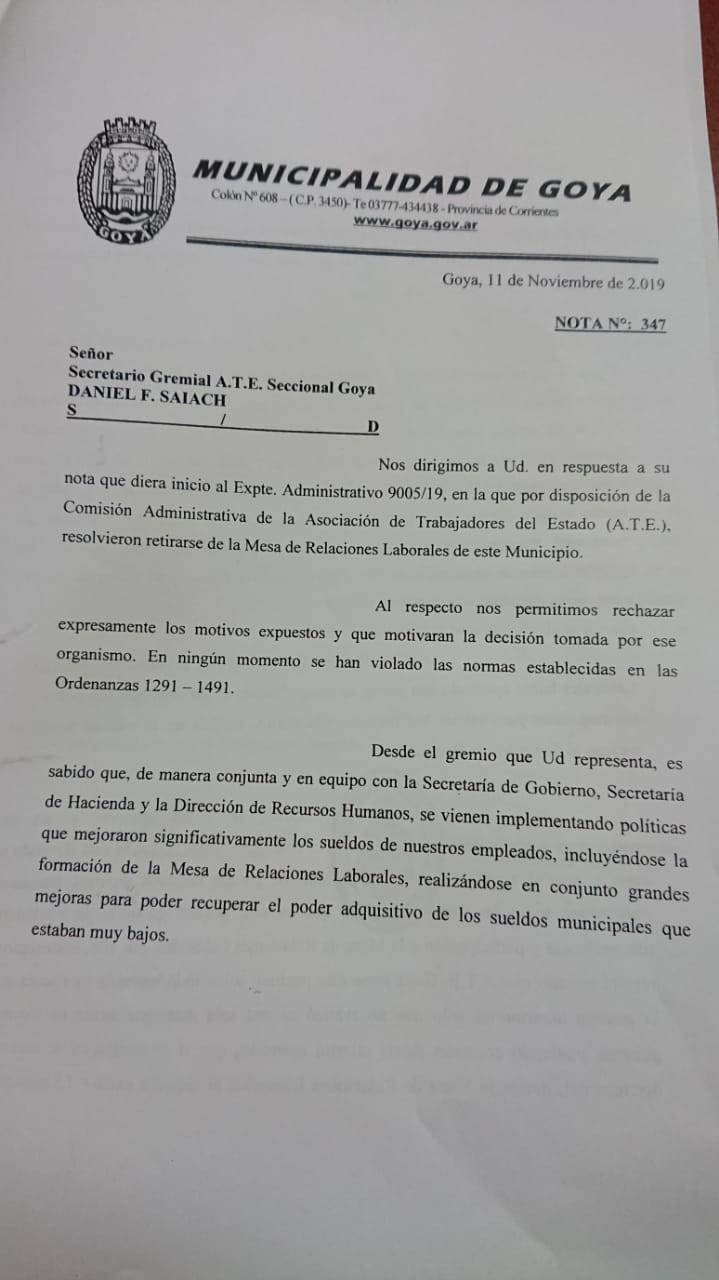La municipalidad de Goya a través de la nota No 347 dio respuesta al Secretario de Ate Seccional Goya, en virtud a la solicitud que diera inicio al expediente 9005/19, por la cual La Comisión de ATE, resolvió retirarse de la mesa de relaciones laborales.