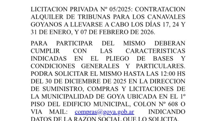 PARA PARTICIPAR DEL MISMO DEBERÁN CUMPLIR CON LAS CARACTERÍSTICAS INDICADAS EN EL PLIEGO DE BASES Y CONDICIONES GENERALES Y PARTICULARES. PODRÁ SOLICITAR EL MISMO HASTA LAS 12:00 HS DEL 30 DE DICIEMBRE DE 2025 EN LA DIRECCIÓN DE SUMINISTRO, COMPRAS Y LICITACIONES DE LA MUNICIPALIDAD DE GOYA UBICADA EN EL 1º PISO DEL EDIFICIO MUNICIPAL, COLÓN Nº 608 O VÍA MAIL: compras@goya.gob.ar INDICANDO DATOS DE LA RAZÓN SOCIAL QUE LO SOLICITA.