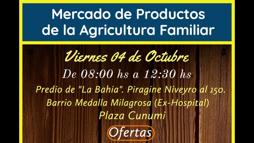 La mesa local de organizaciones de la agricultura familiar recuerda que este viernes 4 de octubre, a partir de las 8:00 horas, se va realizar el Mercado de la Agricultura Familiar, en Plaza Cunumi, Barrio Medalla Milagrosa y Predio La Bahía, con productos frescos y de granja.