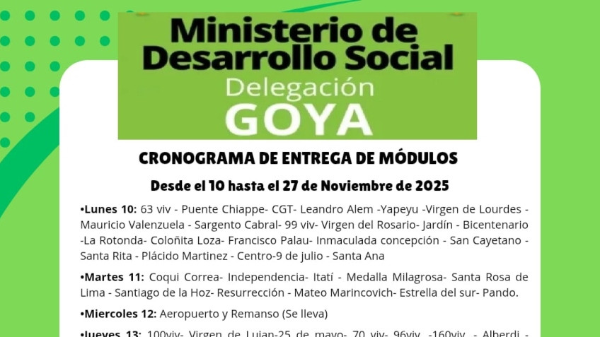 La Delegación Goya de Desarrollo Social informa el cronograma de entrega de módulos alimentarios desde el 6 de octubre hasta el 23 de octubre de 2025. Los módulos se entregarán únicamente en las fechas indicadas en el cronograma. Sin excepciones, presentarse con DNI.