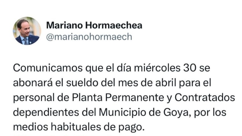 El Intendente de Goya, Mariano Hormaechea, a través de sus redes sociales informó que el próximo día miércoles 30 se abonará por los medios habituales, el sueldo del mes de abril a todo el personal de Planta Permanente y Contratados.