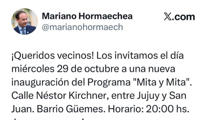 En su mensaje, el jefe comunal de Goya doctor Mariano Hormaechea expresó: “¡Queridos! Los invitamos el día miércoles 29 de octubre a una nueva inauguración del Programa “Mita y Mita”. Calle Néstor Kirchner, entre Jujuy y San Juan. Barrio Güemes. Horario 20:00 hs. ¡Los esperamos! #GoyahaciaAdelante