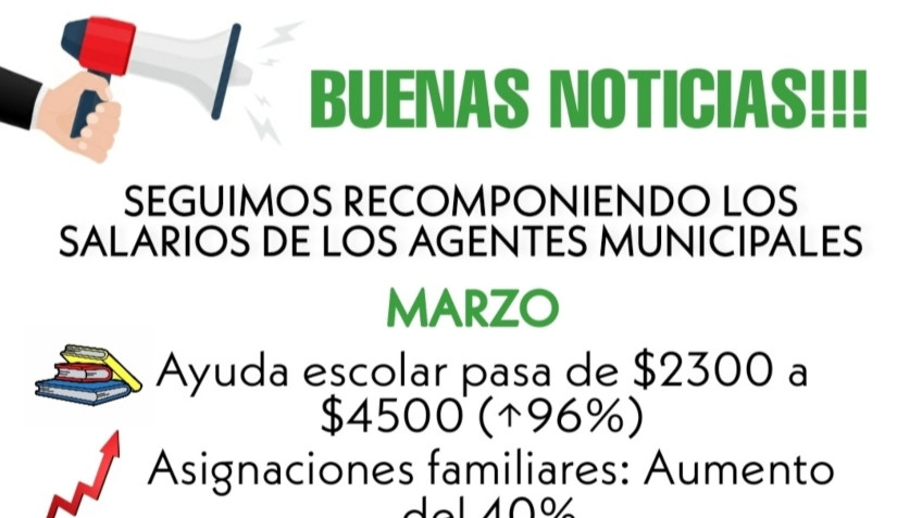 Establecida la política de mejora salarial, por parte de esta Administración Municipal, en el mes de marzo al aumento en el sueldo se incorporan las mejoras en Ayuda Escolar; Asignación Familiar y Asignación por Hijo.