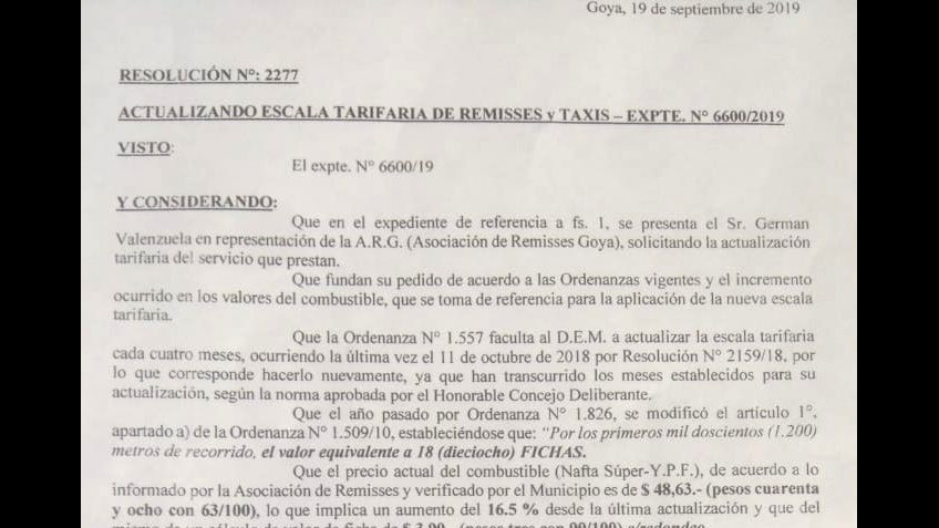 La actualización de la escala tarifaria fue solicitada por la Asociación de Remises de Goya. Se resolvió actualizar contemplando el parámetro de valor máximo de ficha. A partir del lunes 23 de septiembre comienza a tener vigencia la nueva escala tarifaria, esta actualización se basa en la Ordenanza 1557, que faculta al DEM a actualizar la escala tarifaria cada cuatro meses, ocurriendo la última vez, el 11 de octubre de 2018, por Resolución 2159