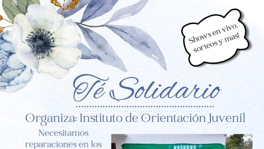 Con el objetivo de recaudar fondos para reparar los núcleos sanitarios de su edificio, el Instituto de Orientación Juvenil organiza este domingo 12 de octubre, a partir de las 17 horas, un Té Solidario en el Salón Emperador del Casino del Litoral. El valor de la tarjeta es de $16.000 e incluye servicio de té, pastelería, shows en vivo y sorteos. Las reservas pueden realizarse a los teléfonos 3777-404664, 3777-536703 o 3794-597128.