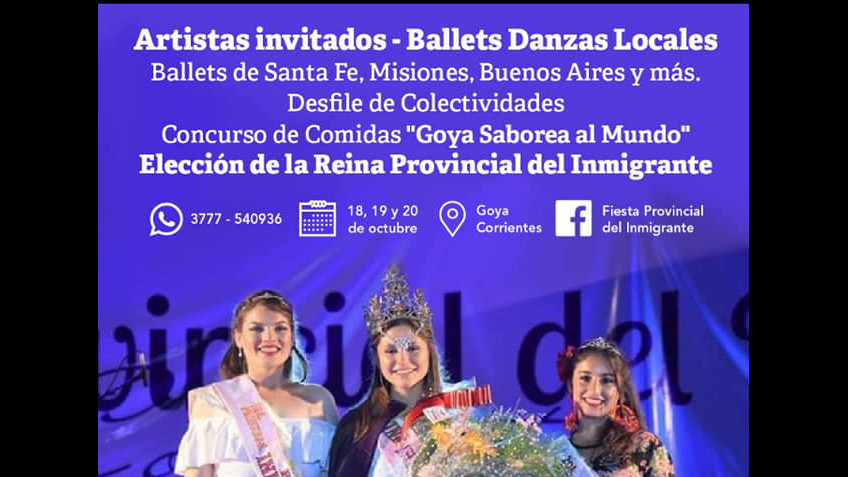 La Municipalidad de Goya, a través de la Dirección de Turismo y la Comisión Municipal Organizadora, confirmaron la participación de más de 20 colectividades en la 6ª Fiesta Provincial del Inmigrante, que tendrá lugar en Goya desde el 18 al 20 de octubre próximo en predio Costa Surubí.