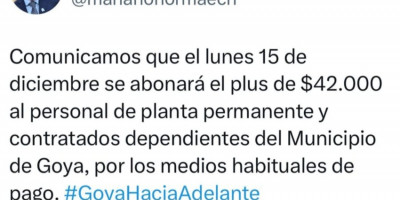 Este Lunes 15 de Diciembre, la Municipalidad de Goya abonará el Plus de $42.000